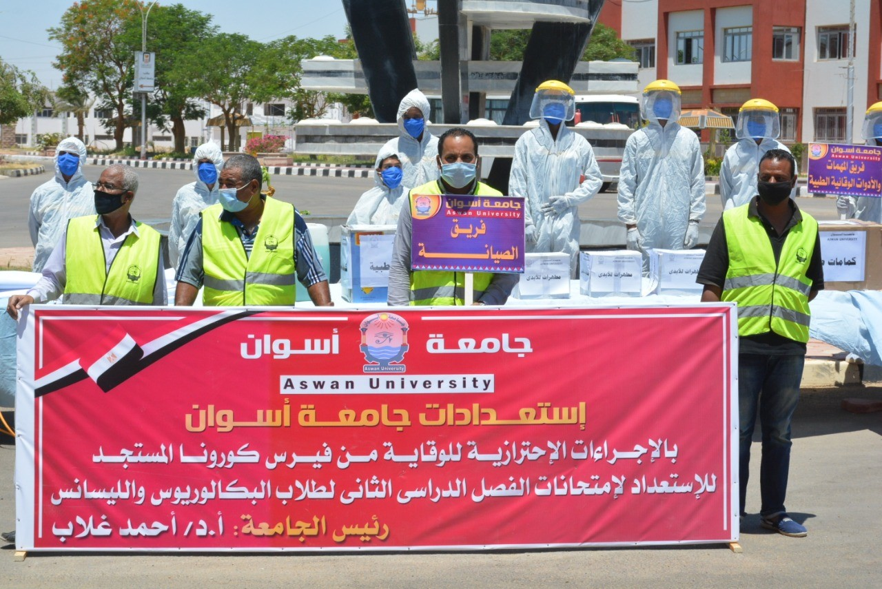 Today corresponding to 5th July 2020 Aswan University president Prof. Ahmed Ghallab inspected the university’s preparations to hold the second-semester exams for the final-year students. 7000 undergraduate and graduate students will take the exams which in some faculties are scheduled to be held on 7th July while in the remaining faculties on the 11th of July 2020. Prof. Ghallab stressed that the university provided means of disinfection and sterilization as well as university-produced face masks. he said that ambulances were provided in Sahary and Aswan Al Gadeda campuses, he visited the cliniques and stressed on the presence of the medical staffs. In the same context, the vice president of graduate studies and research Prof. Ayman Othman said that the university took all the precautionary measures in the examination halls to protect the students against the novel COVID-19. Prof. Ghallab was accompanied by Prof. Ayman Othman, the dean of the faculty of engineering Prof. Loay Saad Al Dein Nasrat, the dean of the faculty of science Prof. Atef Abd El Qader and the faculty of science’s vice dean of education and student’s affairs Prof. Mohammed Abd Al Moneam Raslan.