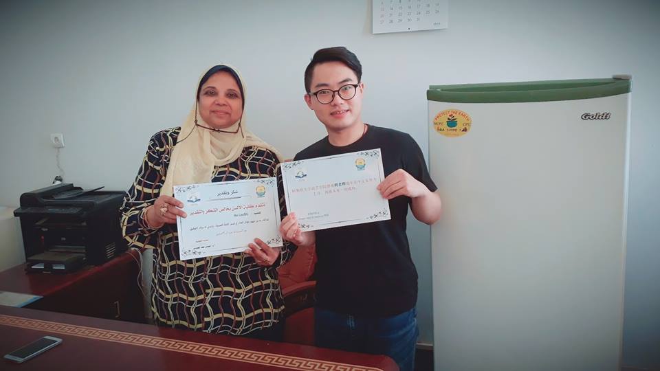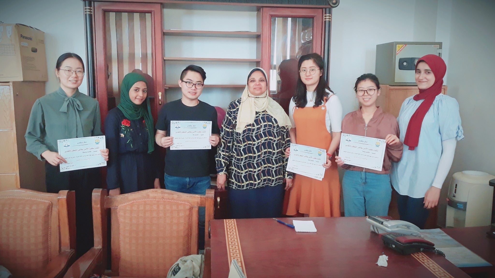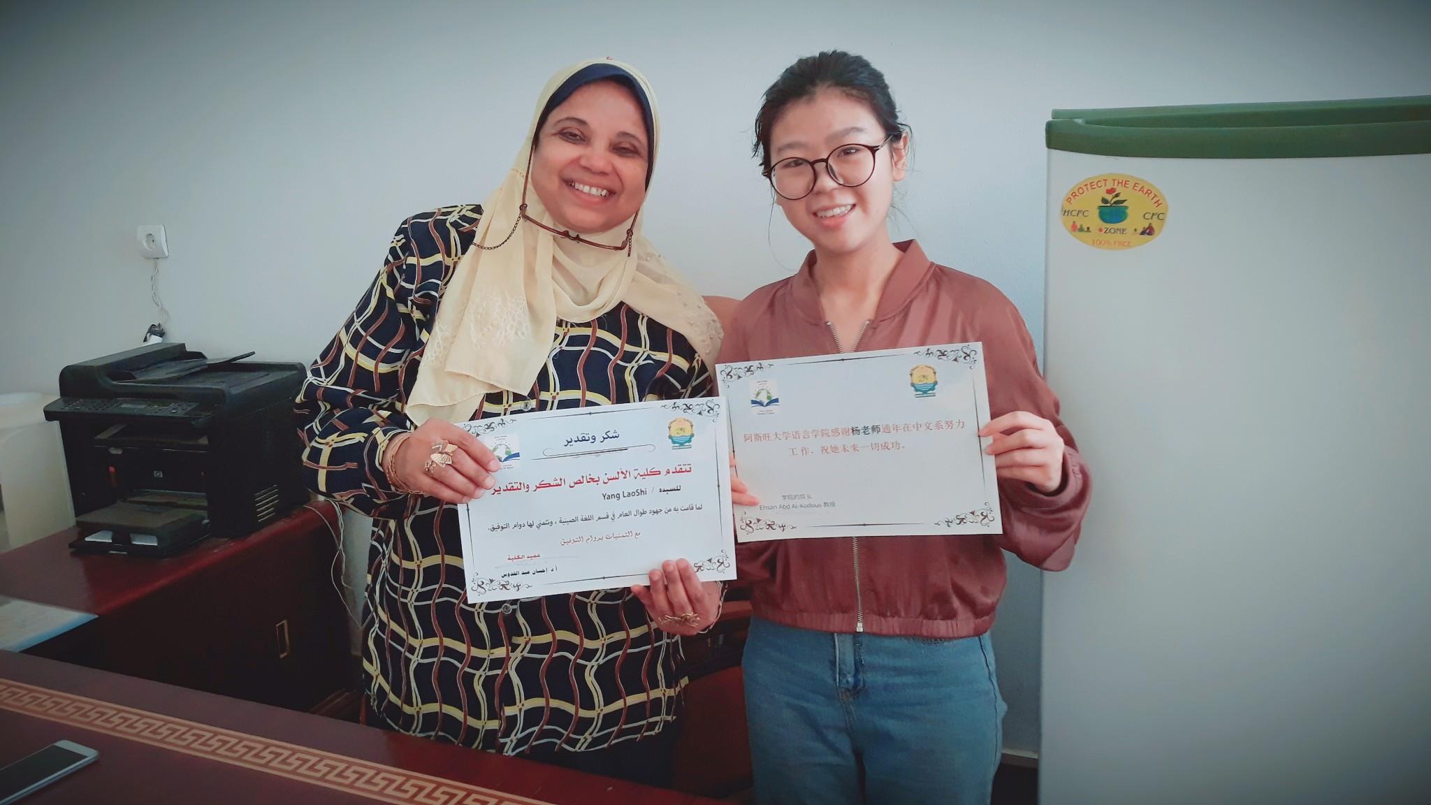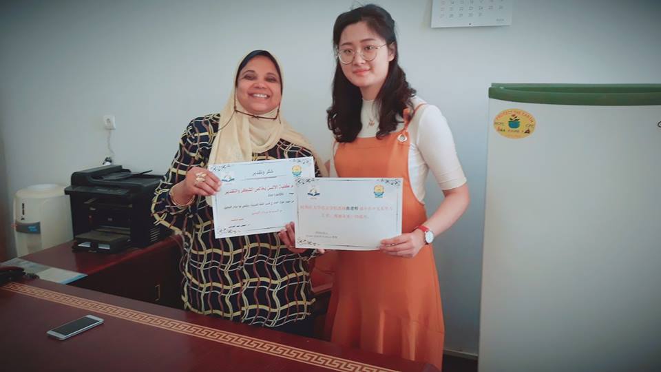 وقامت عميدة الكلية بتوزيع شهادات تقدير باللغتين العربية والصينية ،وتتمني لهم دوام التوفيق في حياتهم العملية .