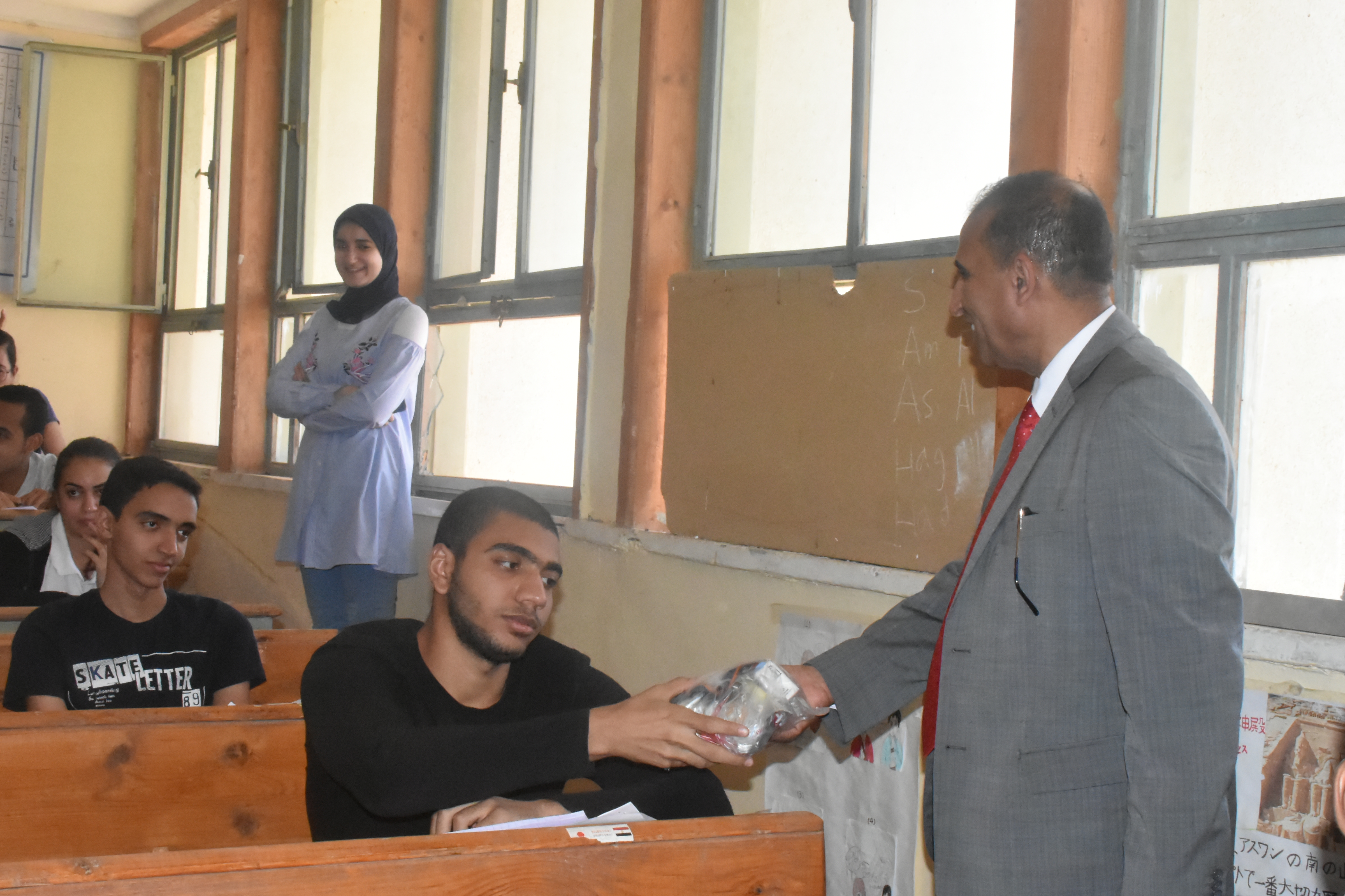 واطمئن رئيس الجامعة علي سير الإمتحانات وخاصة ان الطلاب يؤدون الإمتحانات تحريري وشفوي لضمان سلامة العملية التعليمية، حيث قام سيادته بتقديم وجبة غذائية علي الطلاب داخل اللجان نظراً لشّٙدّٙة الحر بأسوان ، وناقش ‘غلاب’ الطلاب في مستوي ورقة الأسئلة ومدي مطابقتها لمواصفات الجودة والضمان لورقة الأسئلة النموذجية والعمل علي تذليل الصعوبات التي تواجه الطلاب أثناء إمتحانات الفصل الدراسي الثاني .