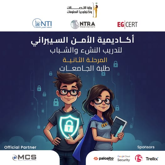 برعاية وزارة الإتصالات وتكنولوجيا المعلومات يعلن المعهد القومي للإتصالات (NTI) ، عن فتح باب التقديم للمرحلة الثانية من أكاديمية الأبطال الخارقين للأمن السيبراني للنشء والشباب، ويأتى ذلك بالتعاون مع الجهاز القومي لتنظيم الإتصالات (NTRA) والمركز الوطني للإستعداد لطوارئ الحاسبات والشبكات (EG-CERT) وبالشراكة مع شركة MCS ، وبرعاية (Palo Alto Networks – Google Cloud Security – f5 – Trellix)، وتخصص لطلاب الجامعات والمعاهد من سن 17 لـ 21 سنة من كل محافظات مصر للمتخصصين ولغير المتخصصين، كما أن البرنامج مجاني بالكامل، ويضم التالى:-