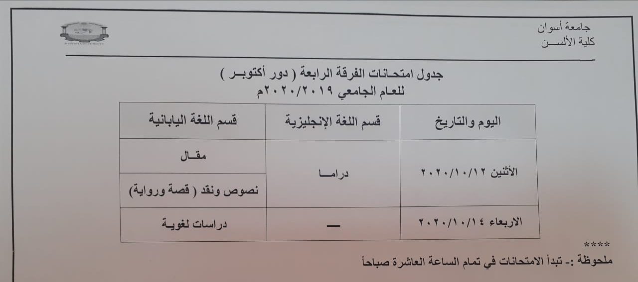 26 Sep 2020 أعلنت كلية الألسن بجامعة أسوان جدول الفرقة الرابعة (دور اكتوبر) ليبدأ يوم الإثنين الموافق 20/10/2020 . جدول الإمتحانات 2020
