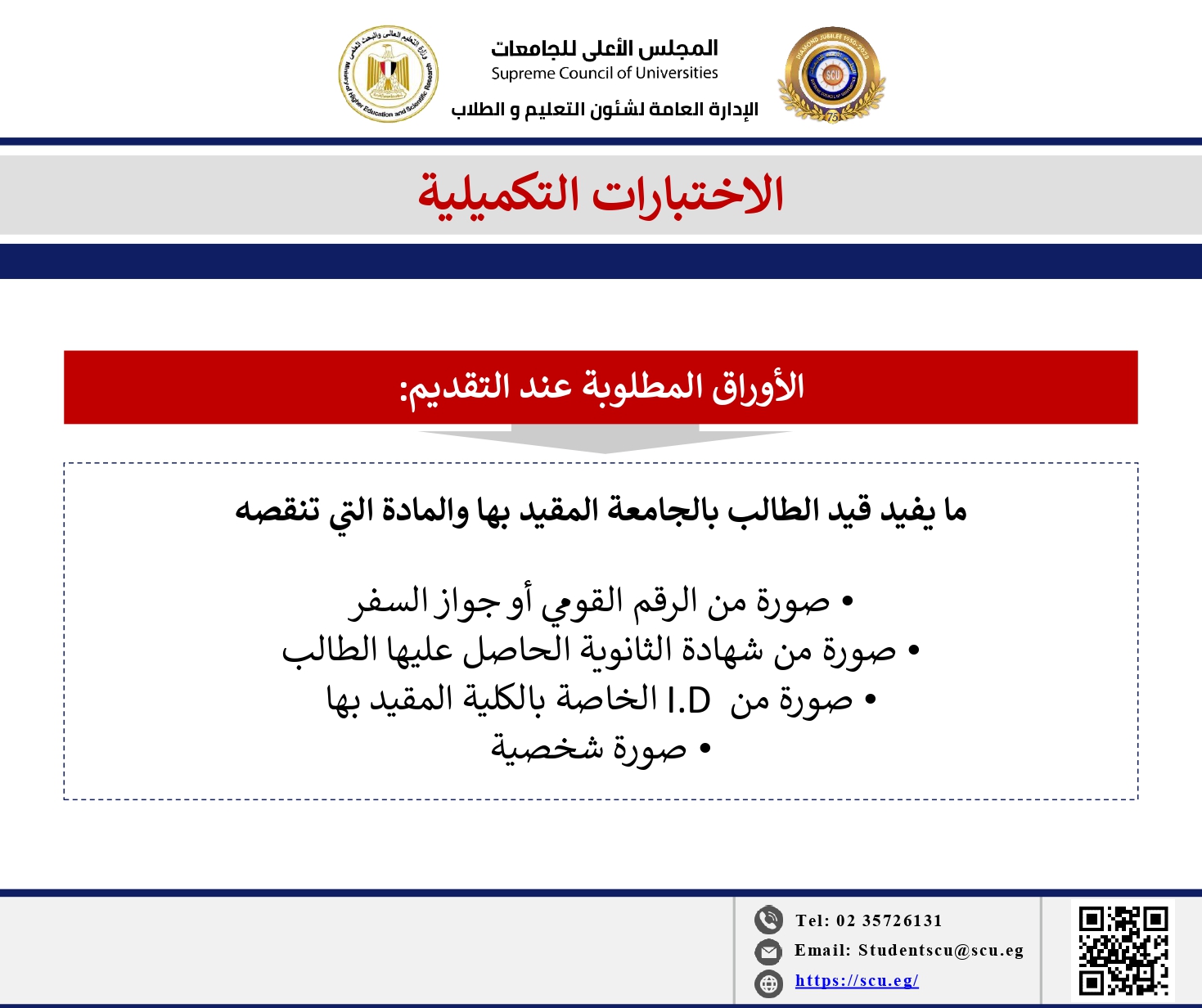 أعلن المجلس الأعلى للجامعات عن تفاصيل الاختبارات التكميلية المقررة لطلاب الشهادات المعادلة العربية والأجنبية، وذلك في إطار حرصه على استكمال متطلبات القبول الجامعي وضمان تكافؤ الفرص بين جميع الطلاب.
