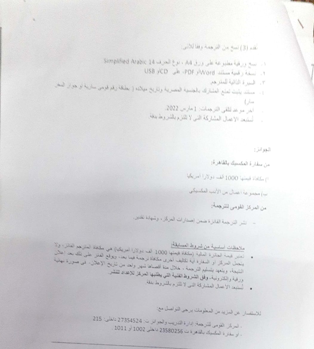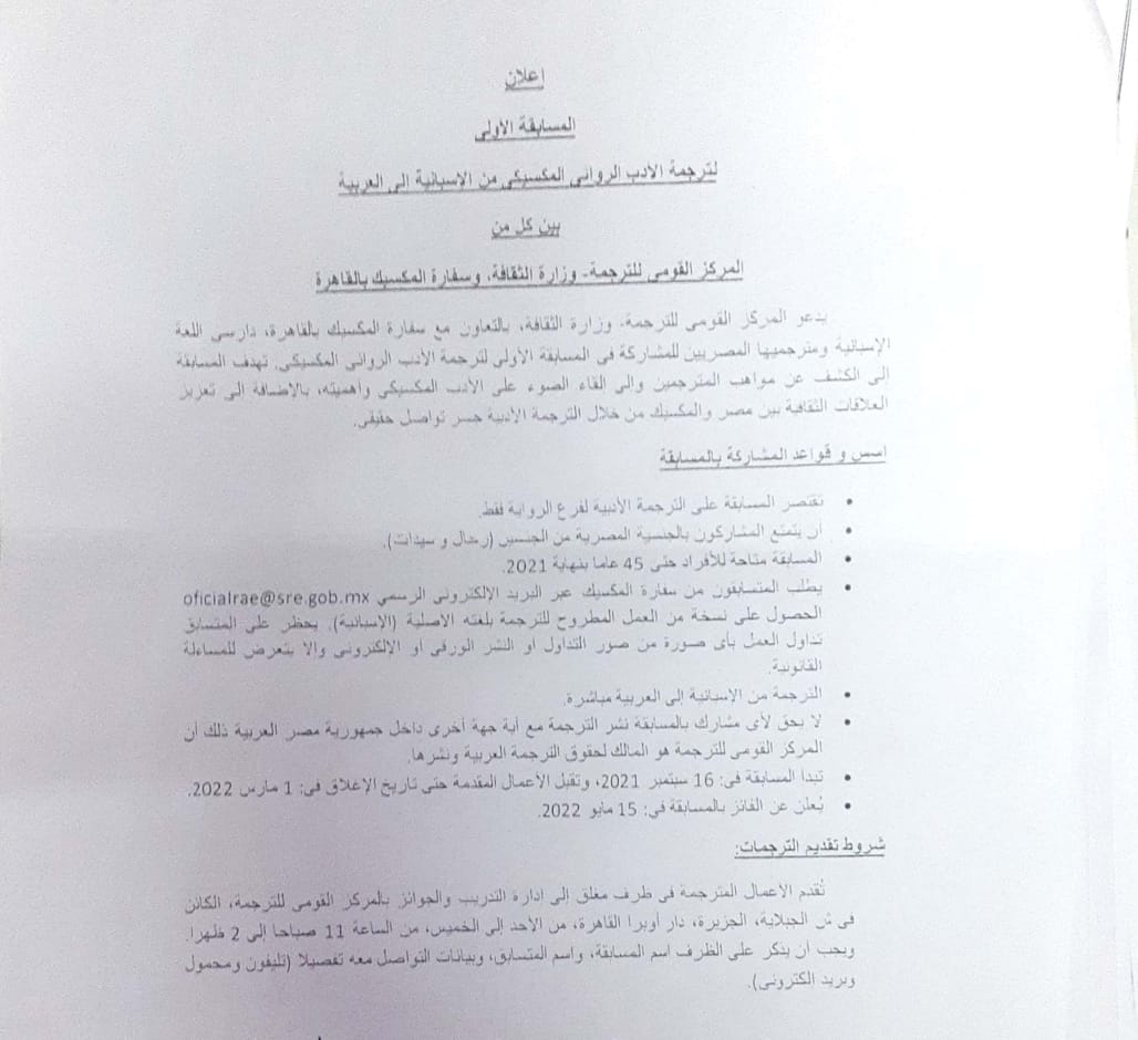 تعلن الإدارة العامة للعلاقات الثقافية عن (إدارة المنظمات الدوابة والمؤتمرات) عن المسابقة الأولى لترجمة الأدب الروائي المكسيكي من الأسبانية إلى العربية , بين كل من المركز القومي للترجمة (أحد المؤسسات الثقاقية التابعة لوزارة الثقافة) ووزارة المكسيك بالقاهرة في الفترة من 16 سبتمبر 2021 وتنتهي في 1 مارس 2022.